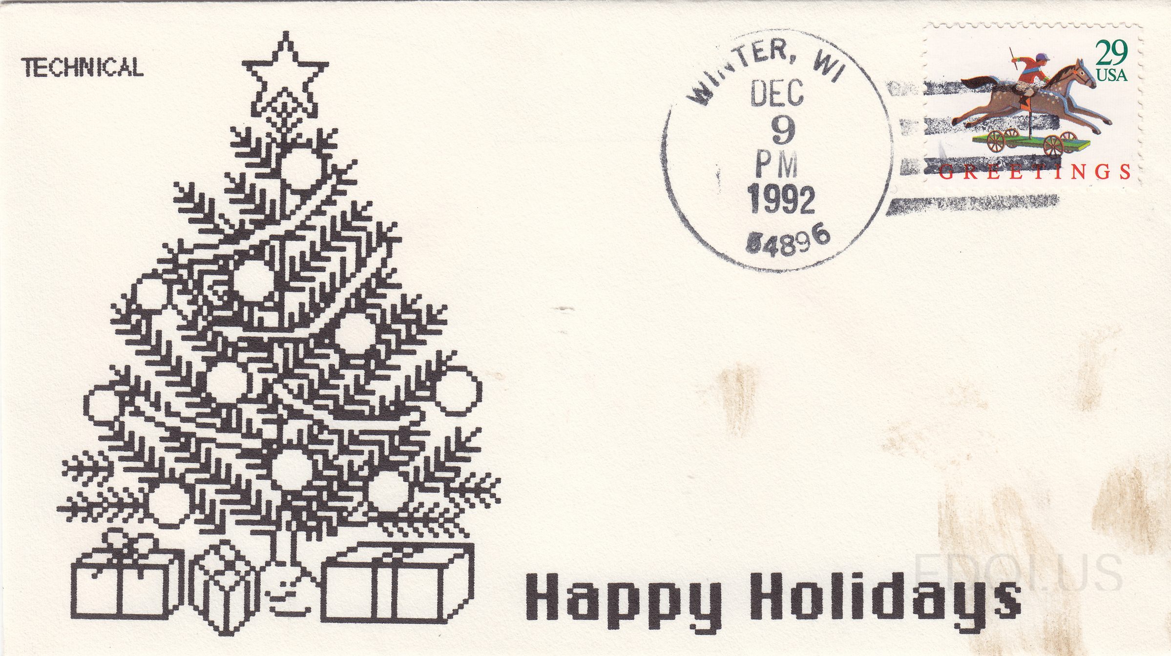 The cachet features a black-and-white pixel/computer-style illustration of a decorated Christmas tree with ornaments, a star topper, and wrapped gifts beneath it, with 'Happy Holidays' printed in bold black text at the bottom right. The word 'TECHNICAL' appears in the upper left corner identifying the cachet maker. The stamp is the 1992 29-cent USA 'Greetings' Christmas stamp depicting a child's toy horse and rider with a toy cannon, in colorful illustration style. The postmark is a hand cancel from Winter, WI dated December 9, 1992.