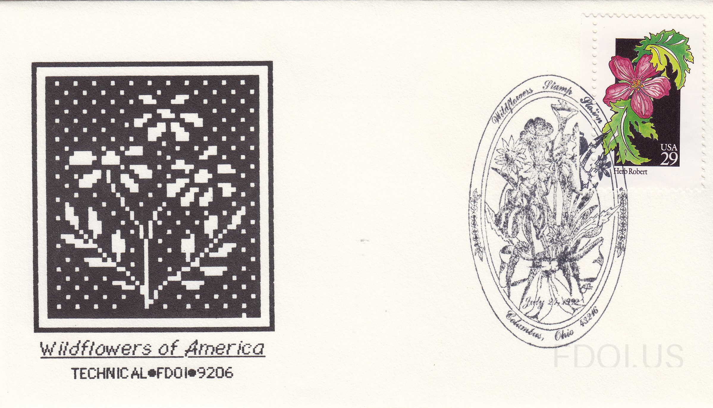 This First Day Cover features the 1992 Fifty Wildflowers series 29-cent Herb Robert stamp, which displays a pink flower with green leaves on a black background. The cover includes a distinctive cross-stitch/pixel-art style cachet in black and white by Technical (catalog FDO1-9206), depicting a generic wildflower plant. The oval pictorial cancellation from the Wildflowers Stamp Show in Columbus, Ohio on July 24, 1992, completes this collectible example of early 1990s wildflower stamp show covers.