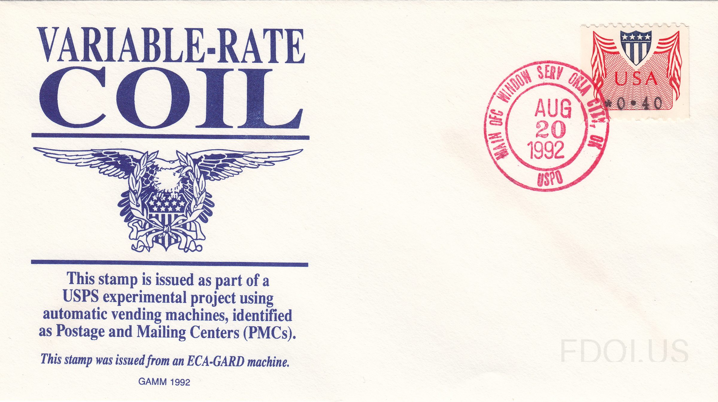 « Previous Unofficial Variable Rate First Day Cover View Full Size All Images The cachet reads, This stamp is issued as part of a USPS experimental project using automatic vending machines, identified as Postage and Mailing Centers. This stamp was issued from an ECA-GARD machine. Cachet Gerry Adlman GAMM Cachets Tags Bullseye Coil GammCachets PostOfficeHistory UnofficialFirstDay VariableRate Dates & Locations Aug. 20, 1992 Oklahoma City, OK, US Related Covers Express Mail, 1983 21c Envelopes Gamm cachet Illinois Inst Tech American Architectur… Jimmie Carter Inaugural Day cover 1st G… Dulles Airport American Architecture 19… Minerals Plate Block