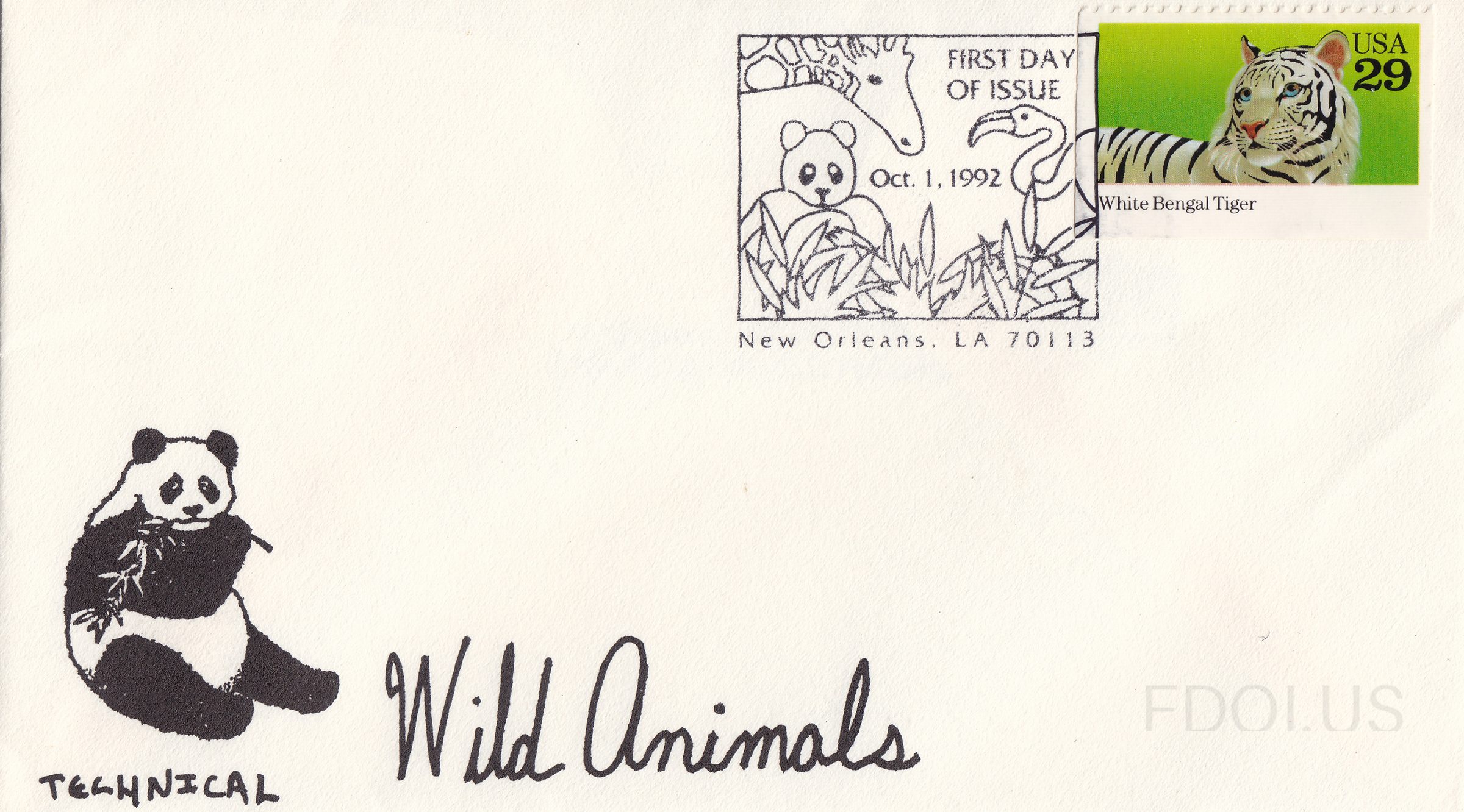 This First Day Cover celebrates the 1992 Wild Animals commemorative series featuring a 29-cent White Bengal Tiger stamp on a vibrant green background. The cachet artwork by Technical Cachets showcases a detailed black-and-white illustration of a giant panda eating bamboo, complemented by a pictorial cancellation depicting various wildlife including a giraffe, flamingo, and panda. Postmarked October 1, 1992, in New Orleans, Louisiana, this cover honors endangered species conservation through postal imagery.