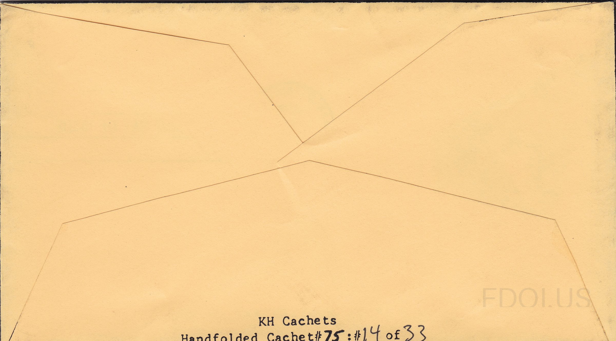 This image shows the reverse/back side of a First Day Cover envelope. The envelope is cream/yellow in color with standard diamond-fold flap construction visible. No cachet artwork, stamps, or postmark are visible on this side. Handwritten text at the bottom reads 'KH Cachets' and 'Handfolded Cachet #75: #14 of 33', indicating this is a limited edition handfolded cachet, number 14 out of a run of 33.