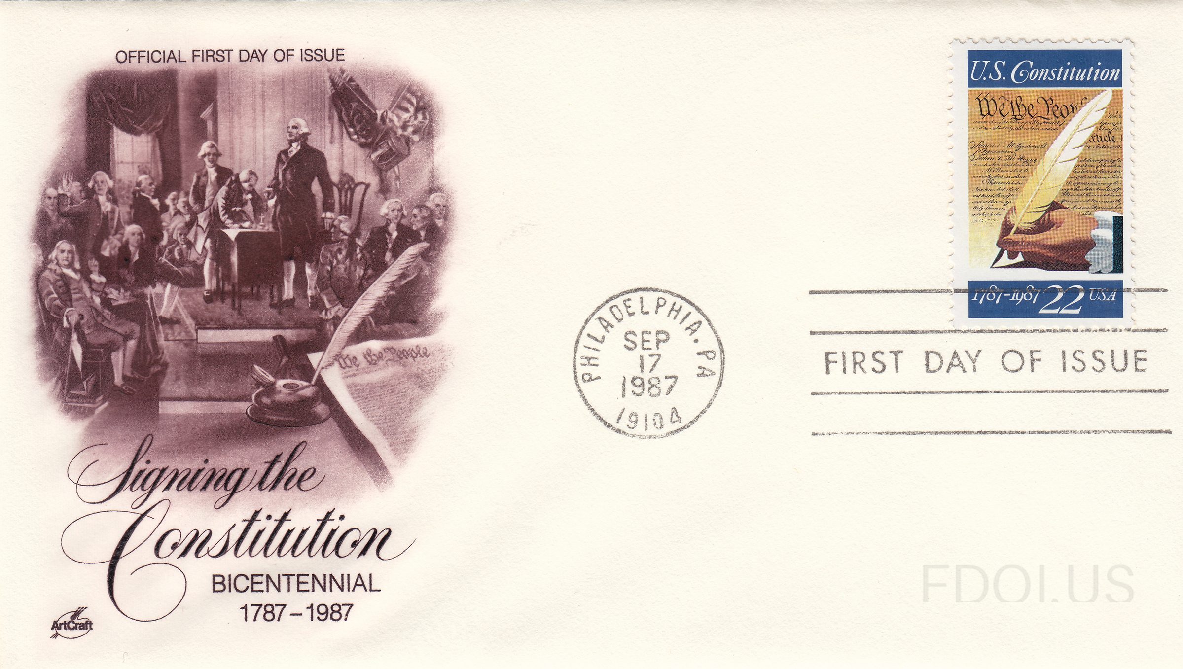 « Previous Signing of the Constitution View Full Size All Images ArtCraft cachet for the Bicentennial of the Signing of the Constitution. Cachet Artcraft Format Other Tags 1980s 200years ArtcraftCachets FederalGovernment OfficialFirstDay OneColor Patriotic Unaddressed UnitedStates Dates & Locations Sept. 17, 1987 Philadelphia, PA, US Related Covers Congress Bicentennial Cooperation in Space Cooperation in Space New York Stock Exchange Cooperation in Space Virginia Capes and Yorktown