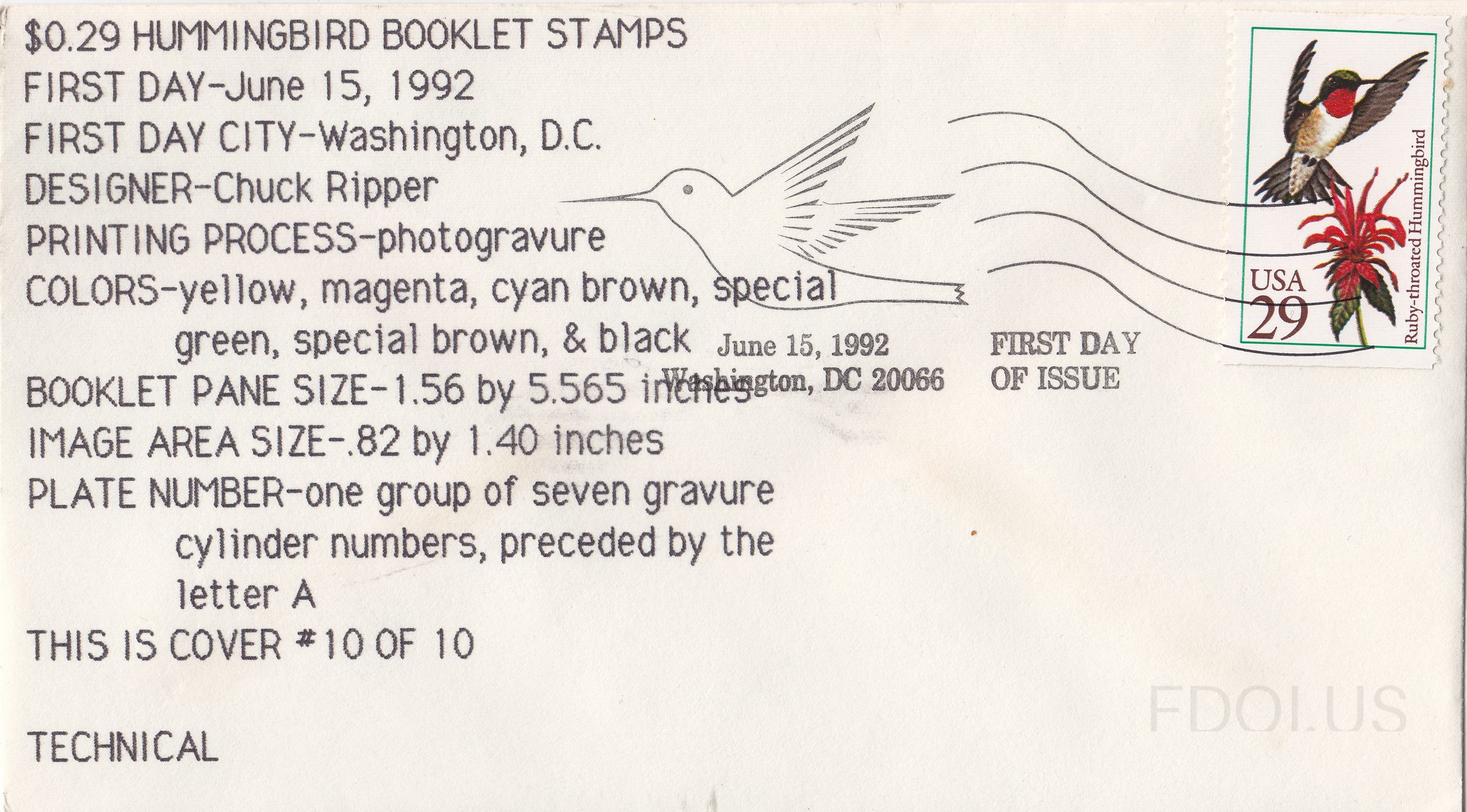 This First Day Cover features a minimalist line-drawn hummingbird cachet that complements the vibrant photogravure stamp depicting a ruby-throated hummingbird hovering near a red flower. Issued by Technical Cachets and postmarked June 15, 1992 in Washington, DC, this cover is number 10 of a 10-cover series and includes extensive technical philatelic notation. The cover celebrates the 1992 Hummingbird Booklet series, designed by Chuck Ripper.
