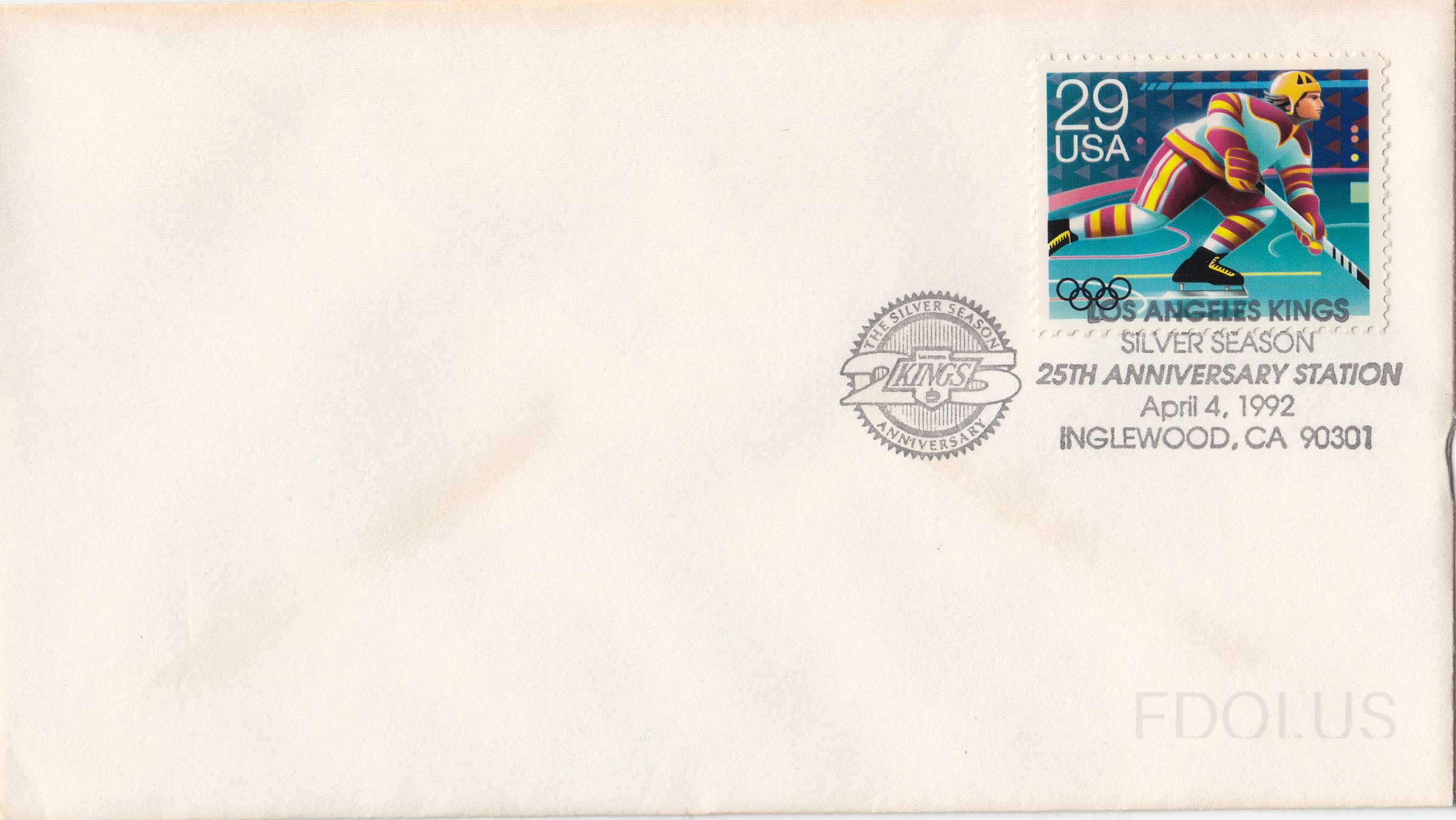 This cover features no traditional cachet artwork on the left side — the envelope is plain white. The stamp is the 1992 USA 29-cent Winter Olympics ice hockey stamp, depicting a hockey player in action with the Olympic rings visible. A special pictorial cancellation for the Los Angeles Kings 'Silver Season' 25th Anniversary is applied, featuring the Kings logo. Printed text adjacent to the stamp reads 'LOS ANGELES KINGS / SILVER SEASON / 25TH ANNIVERSARY STATION / April 4, 1992 / INGLEWOOD, CA 90301'. The cover is in good condition with minor toning.