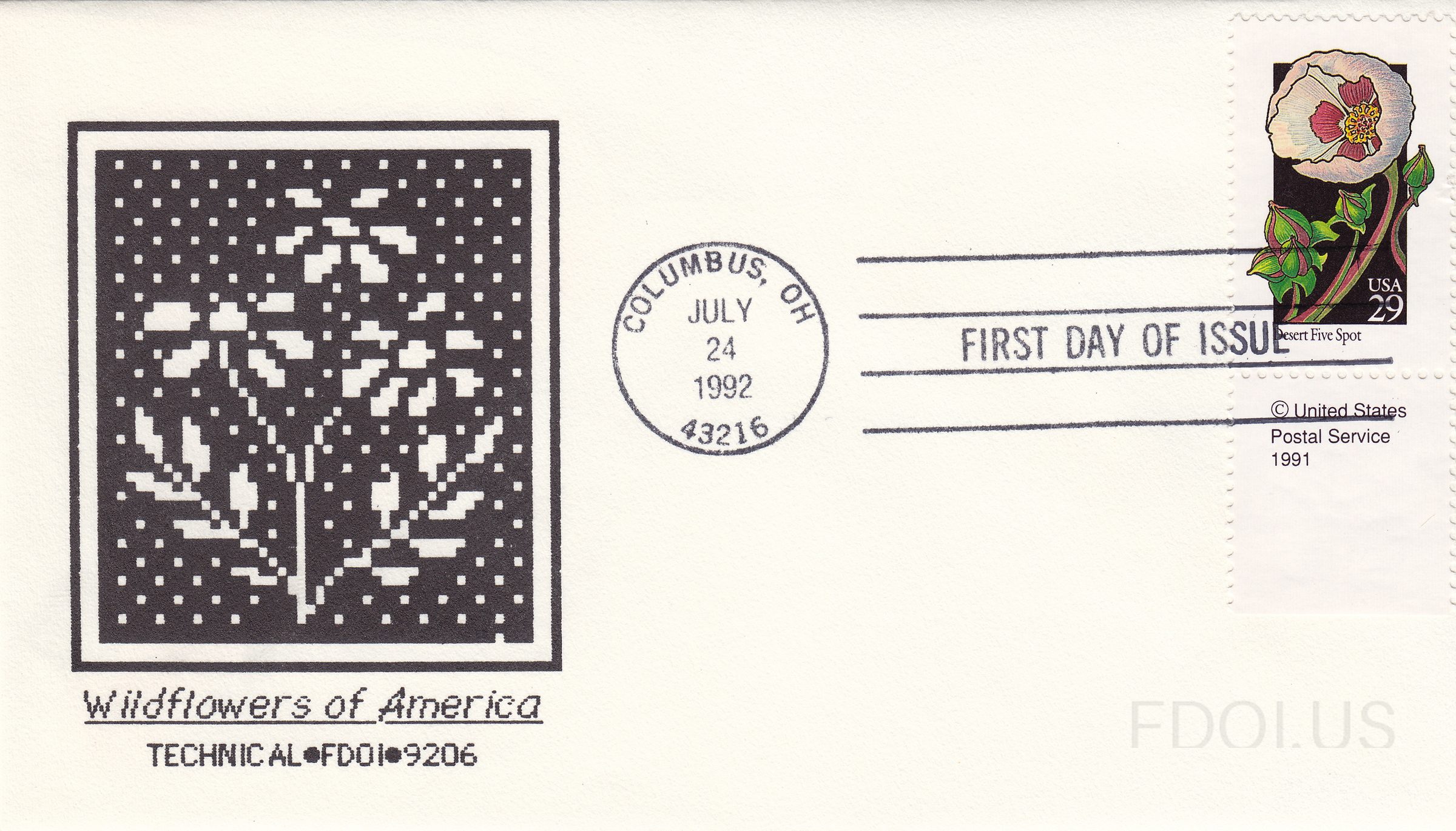 This First Day Cover commemorates the 1992 Wildflowers of America series, featuring the Desert Five Spot stamp with its distinctive white bloom and pink center. The cachet displays a striking pixelated digital art interpretation of wildflowers in black and white, creating an elegant modernist frame for the botanical subject. The cover bears a July 24, 1992 machine cancel from Columbus, OH and was created by Technical Cachets, a respected cachet maker known for artistic envelope designs.