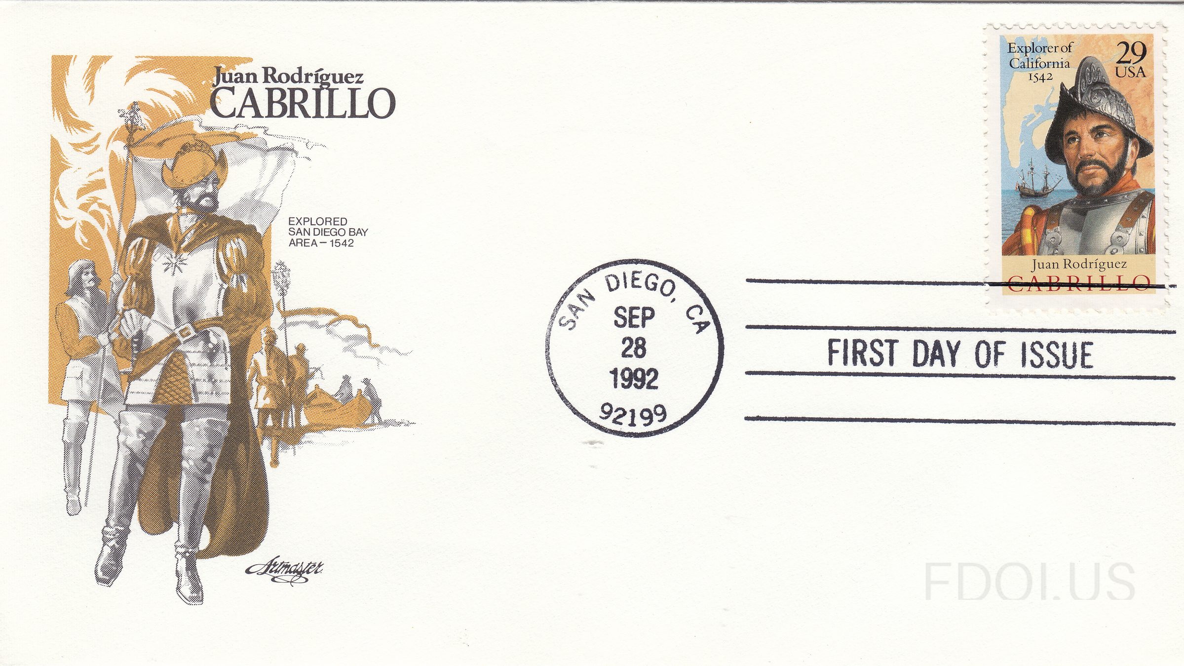 « Previous Next » Cabrillo honored in San Diego View Full Size All Images Additional Images Juan Rodriguez Cabrillo explored San Diego Bay area 1542. Cachet Artmaster Format Other Tags 1990s 450years ArtmasterCachets MoreThanOneImage OfficialFirstDay Dates & Locations Sept. 28, 1992 San Diego, CA, US Related Covers Malcom X Artmaster FDC Vertically Printed Coil Stamp Olympic Baseball Kentucky Statehood Bicentennial Princesse Grace Kelly FDC from Monaco Artmaster Variable Rate Coil