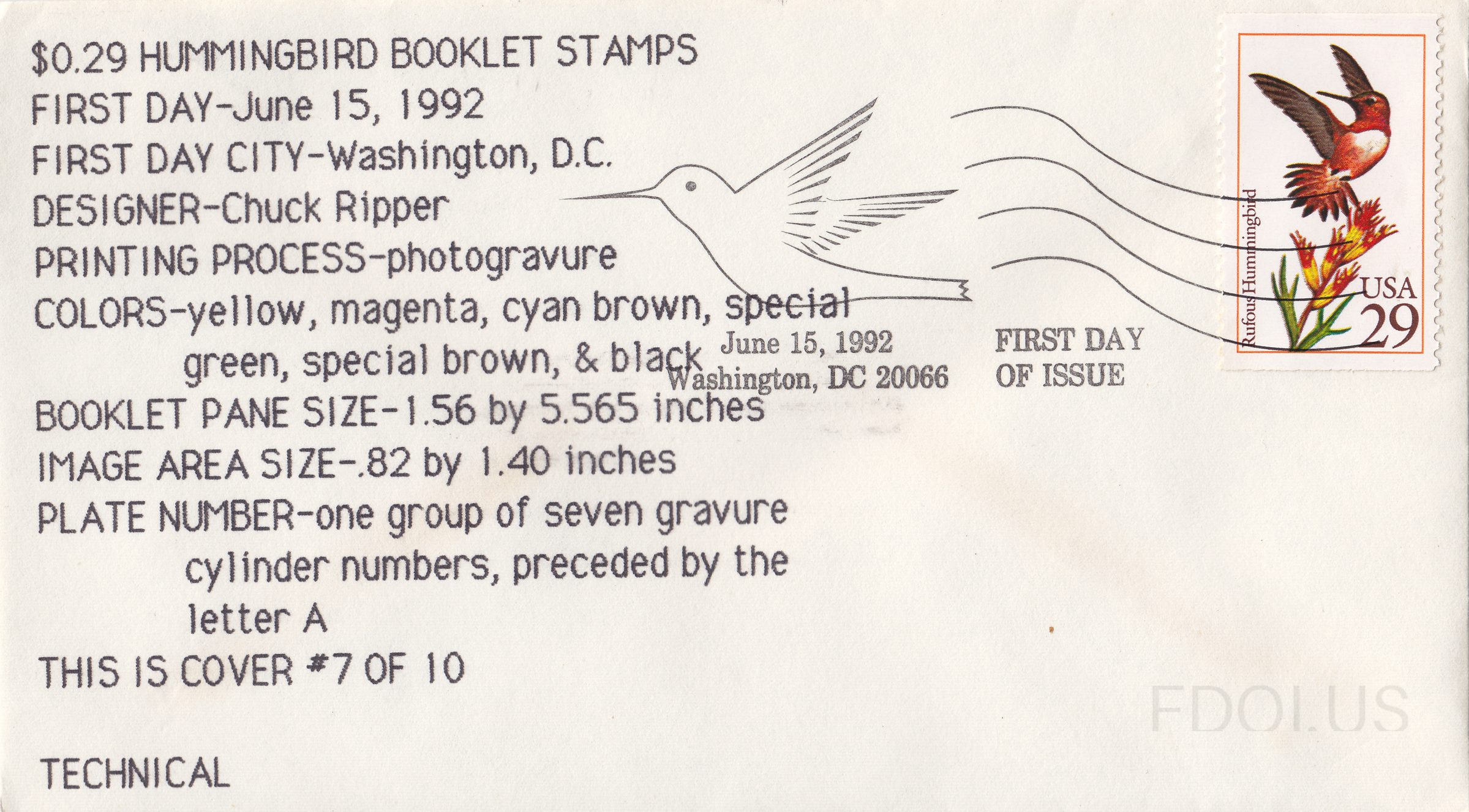 This First Day Cover features a minimalist line-drawn hummingbird cachet by Technical Cachets, complementing the vibrant 29-cent Rufous Hummingbird booklet stamp designed by Chuck Ripper. The cover showcases detailed technical specifications printed on the envelope and bears a June 15, 1992 Washington, DC postmark marking the stamp's official issue date. This is cover #7 of a limited 10-cover numbered edition.