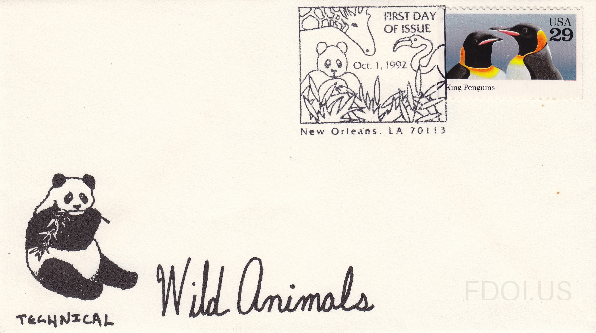 This First Day Cover features a Technical Cachets design showcasing a giant panda eating bamboo in black ink, complemented by a colorful 29-cent King Penguins stamp from the 1992 Wild Animals commemorative series. The pictorial cancel depicts a diverse wildlife scene with a panda, giraffe, and flamingo among bamboo vegetation, postmarked October 1, 1992, from New Orleans, Louisiana, celebrating the natural world through philately.