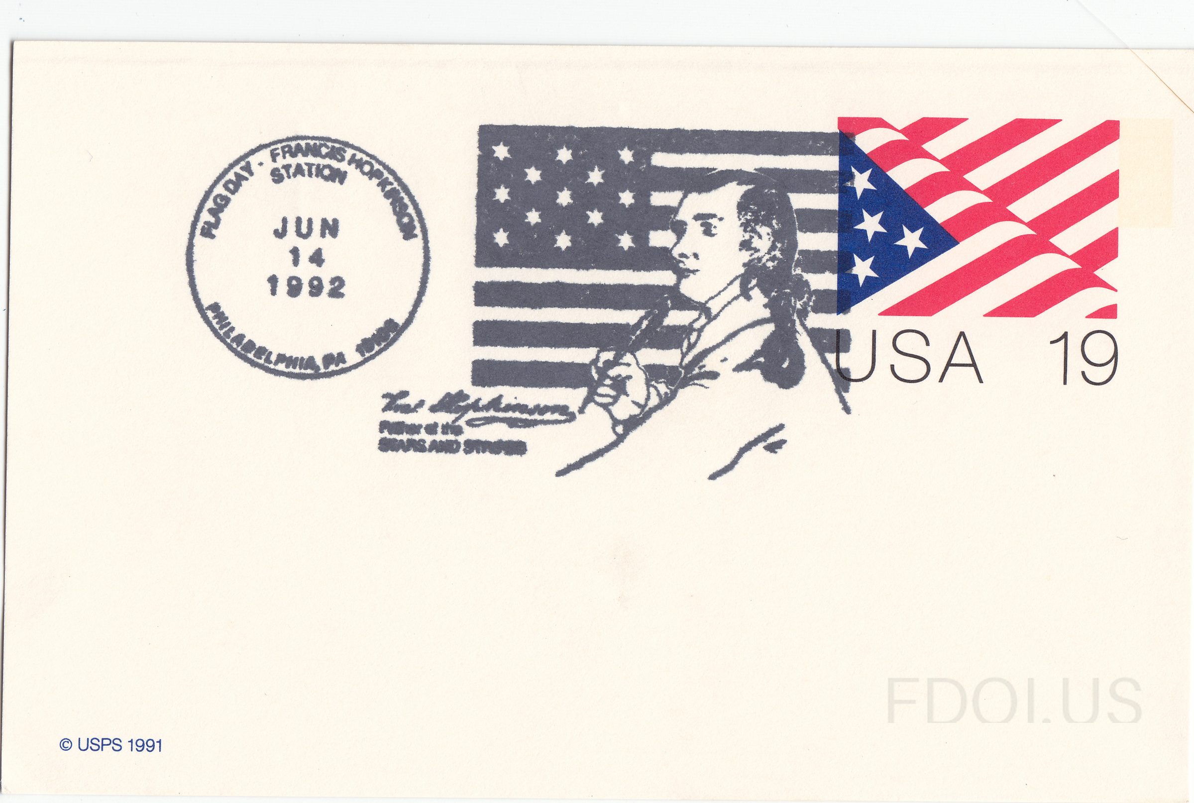 « Previous Flag Day Francis Hopkinson Station View Full Size All Images Flag Day Francis Hopkinson Station in Philadelphia, series also in Bordentown Tags CropImage DuplicateItem Flag Patriotic PictorialCancel PostalCard SameDayTwoCities Related Covers Flag Day Francis Hopkinson Station Obama 2009 Wilmington Inaugural Cover Flag Day For McHenry Station Dorr Rebellion Station Encouraging Young Philatelists Disabled American Veterans and POW MIA