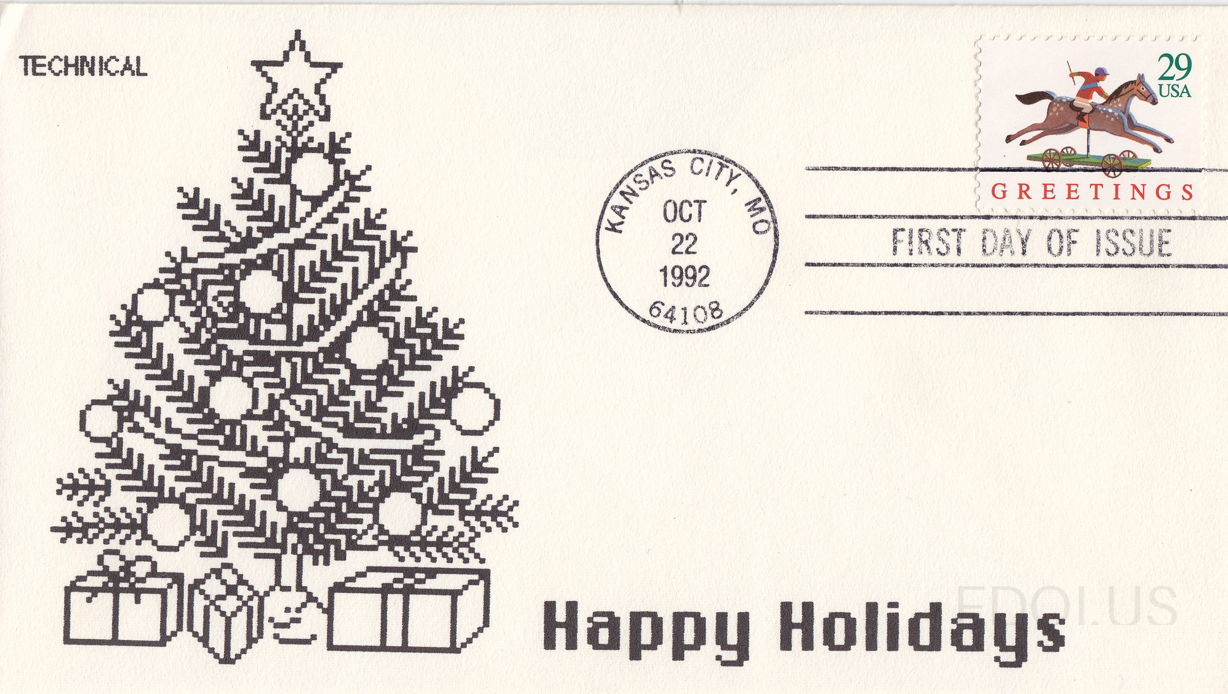 This First Day Cover features a festive black-and-white pixel-art cachet by Technical Cachets depicting a decorated Christmas tree with ornaments, star, and wrapped gifts beneath, complemented by bold 'Happy Holidays' text. The 29-cent stamp showcases a colorful antique horse-and-rider weathervane toy in red, blue, and green from the 1992 Greetings stamp series. The cover is postmarked October 22, 1992, from Kansas City, Missouri on the first day of issue.