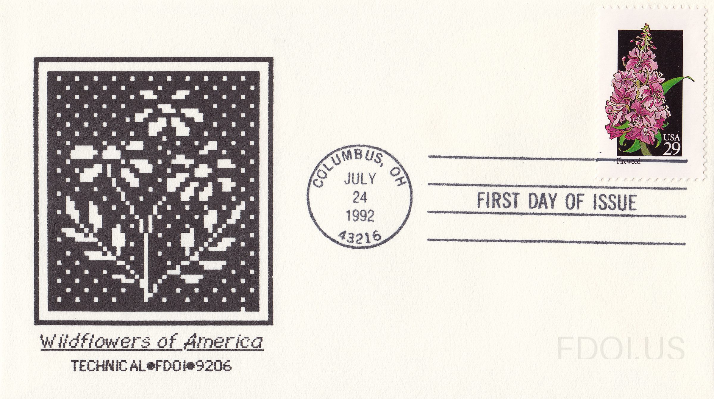 The cachet features a black and white pixelated/dot-matrix style artwork depicting a wildflower plant, printed in a square vignette on the left side of the envelope. Below the artwork is the text 'Wildflowers of America' in italic script, with 'TECHNICAL•FDOI•9206' beneath it. The stamp is a 29-cent USA 'Fireweed' wildflower stamp showing pink blooms against a dark background, and the postmark is a circular hand cancel from Columbus, OH dated July 24, 1992 with ZIP code 43216, accompanied by a 'FIRST DAY OF ISSUE' machine slogan cancel.