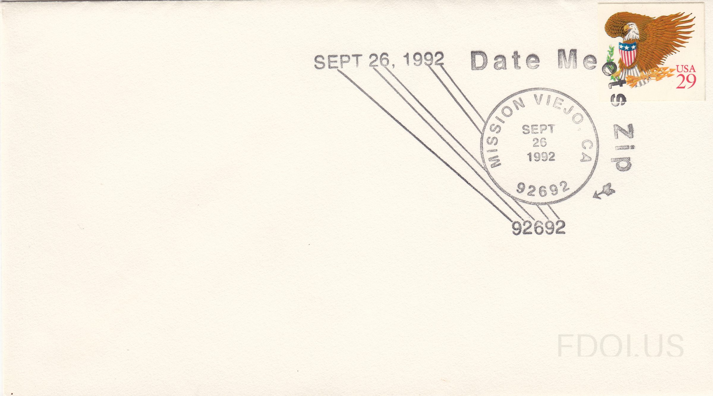 « Previous Date Meets Zip 92692 View Full Size All Images Date Meets Zip 92692 Format Other Tags PictorialCancel PostOfficeHistory SelfAdhesive Unaddressed ZipMeetsDate Dates & Locations Sept. 26, 1992 Mission Viejo, CA, US Related Covers Zip Meets Date 32793 Long Beach Business Center Columbus Day 1992 Zip Meets Date 10992 USPS Statue of Liberty plate number USPS Firsts