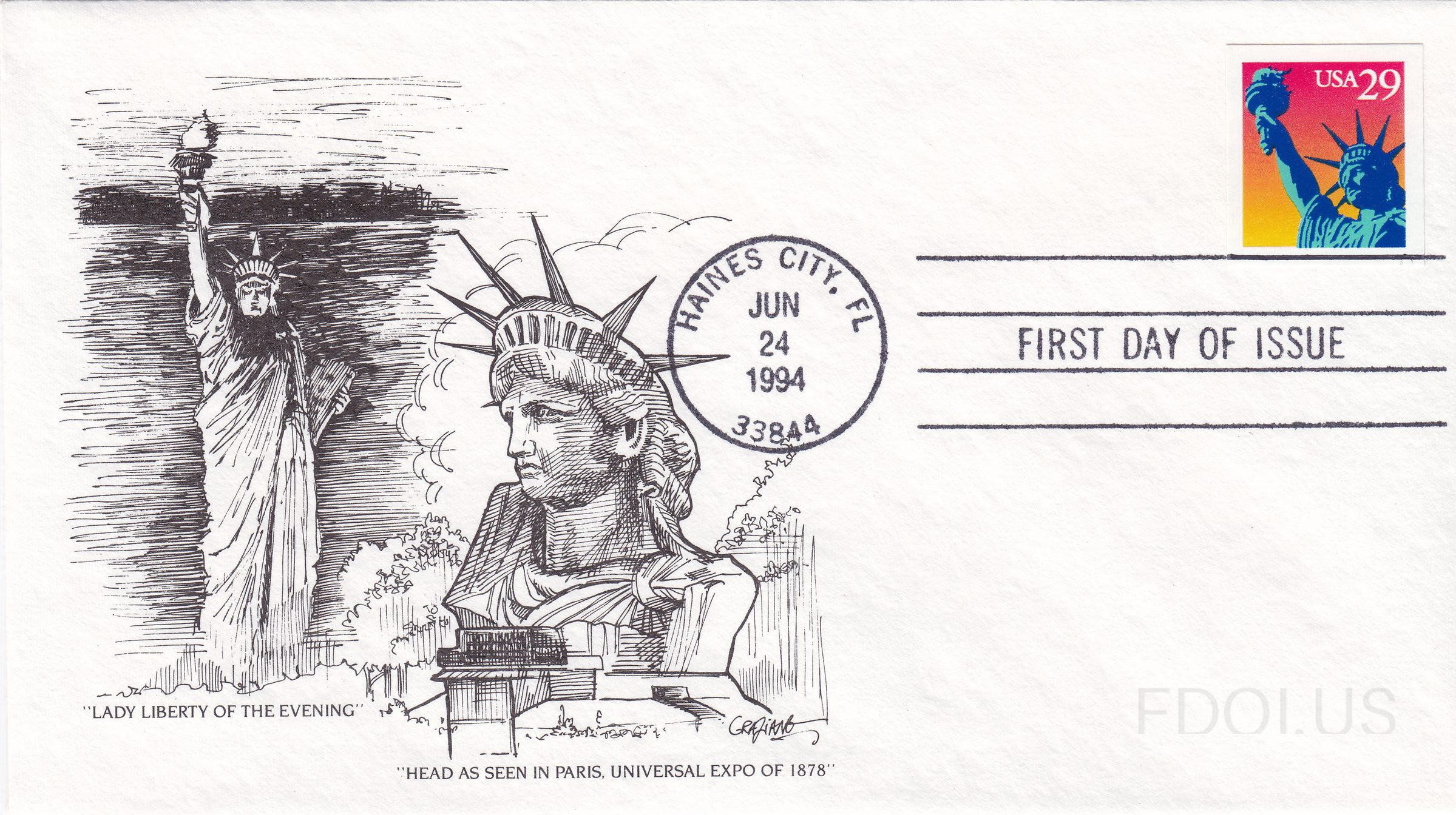 « Previous Statue of Liberty at Americover 1994 View Full Size All Images Lady Liberty of the Evening and Head as seen in Paris at Universal Expo of 1878 Tags Cachet HandCancel OfficialFirstDay OneColor StatueOfLiberty Unaddressed Dates & Locations June 24, 1994 Haines City, FL, US Related Covers Statue of Liberty at Americover 1994 Statue of Liberty at Americover 1994 Haines City Liberty WWII Wendell Willkie Wendell Willkie