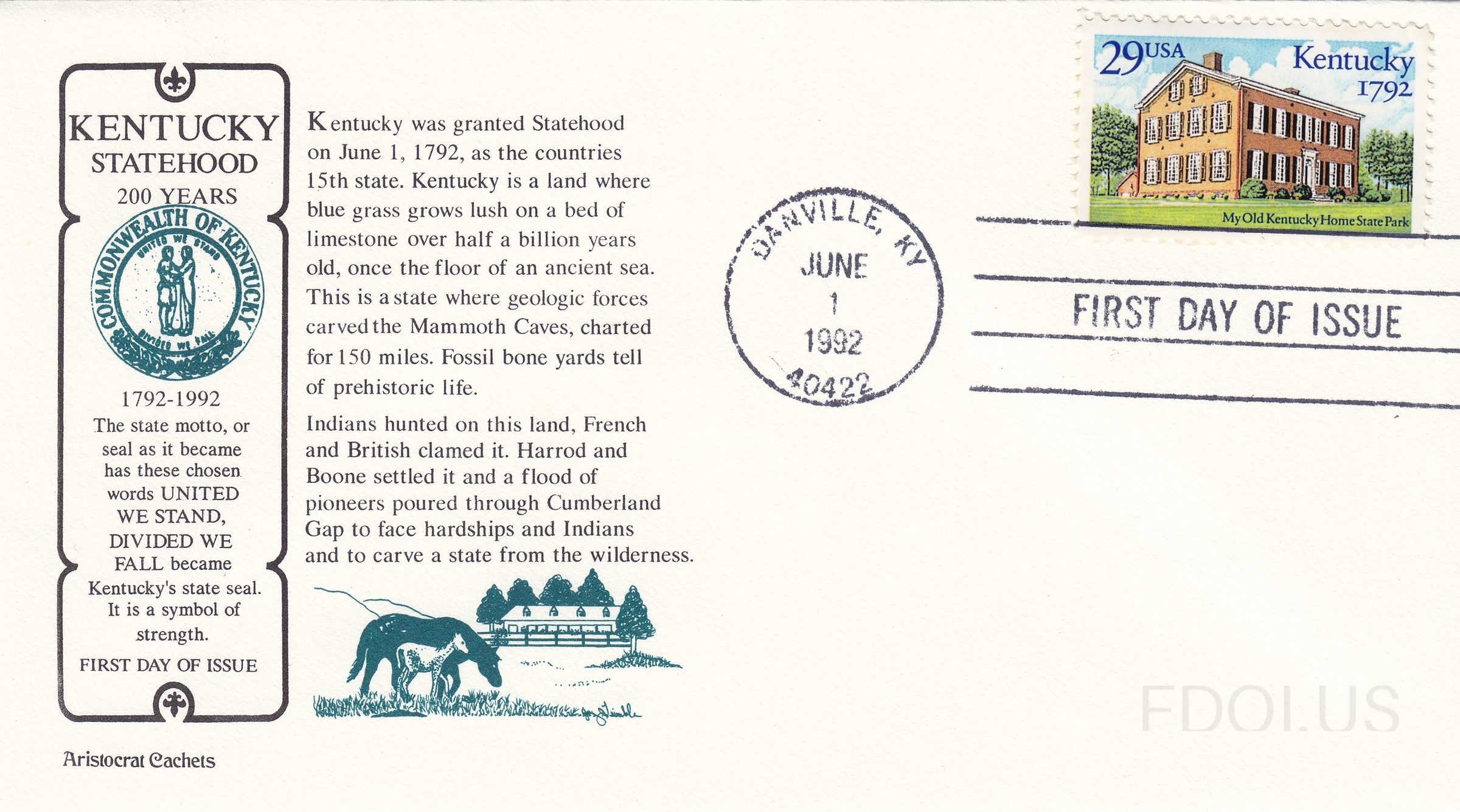 « Previous Kentucky Statehood View Full Size All Images FDC with text about state history and illustrations of horses and the state seal. Cachet Aristocrat Cachets Tags AristocratCachets Horses Kentucky OfficialFirstDay TwoColors Dates & Locations June 1, 1992 Danville, KY, US Related Covers Buffalo Soldiers Fort Huachuca Station 1792 Kentucky Statehood Kentucky Statehood Bicentennial Kentucky Statehood Bicentennial Organized Labor Proud and Free Kentucky Statehood Bicentennial