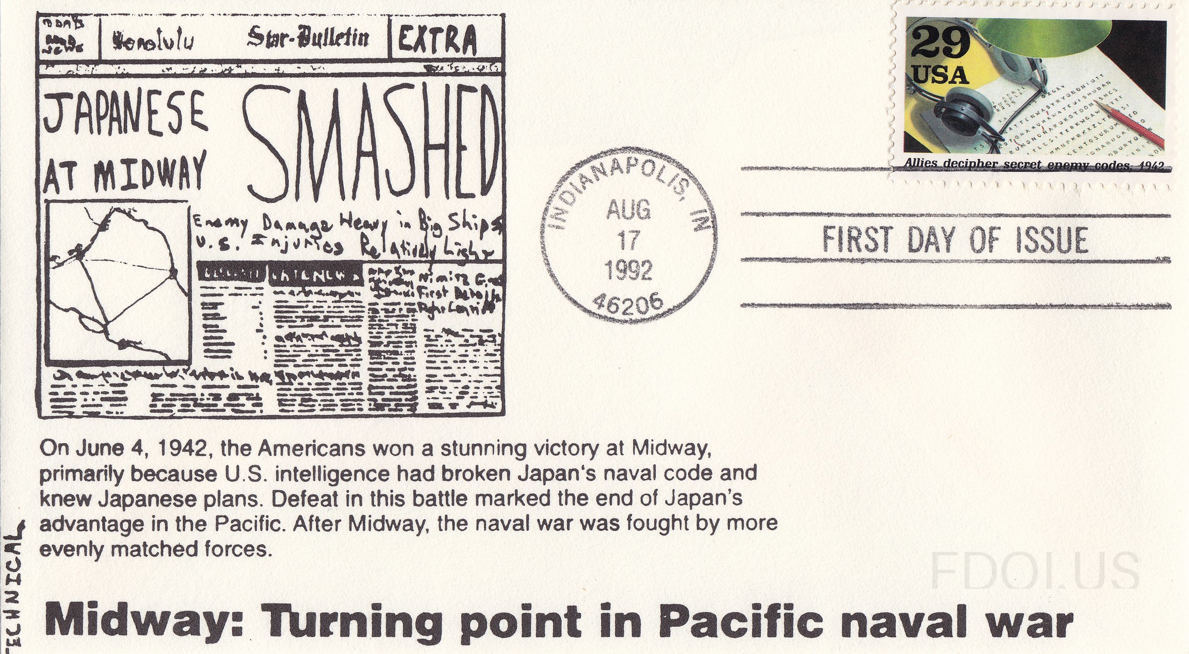 This cover features a striking black-and-white cachet reproduction of a Honolulu Star-Bulletin newspaper headline announcing the American victory at the Battle of Midway on June 4, 1942, highlighting the crucial role of broken Japanese naval codes in the triumph. The 29-cent stamp depicts the code-breaking efforts of the Allies during WWII, showing headphones, a pencil, and encrypted text. Hand-cancelled in Indianapolis on August 17, 1992, this cover by Technical Cachets commemorates one of the Pacific War's most significant turning points.