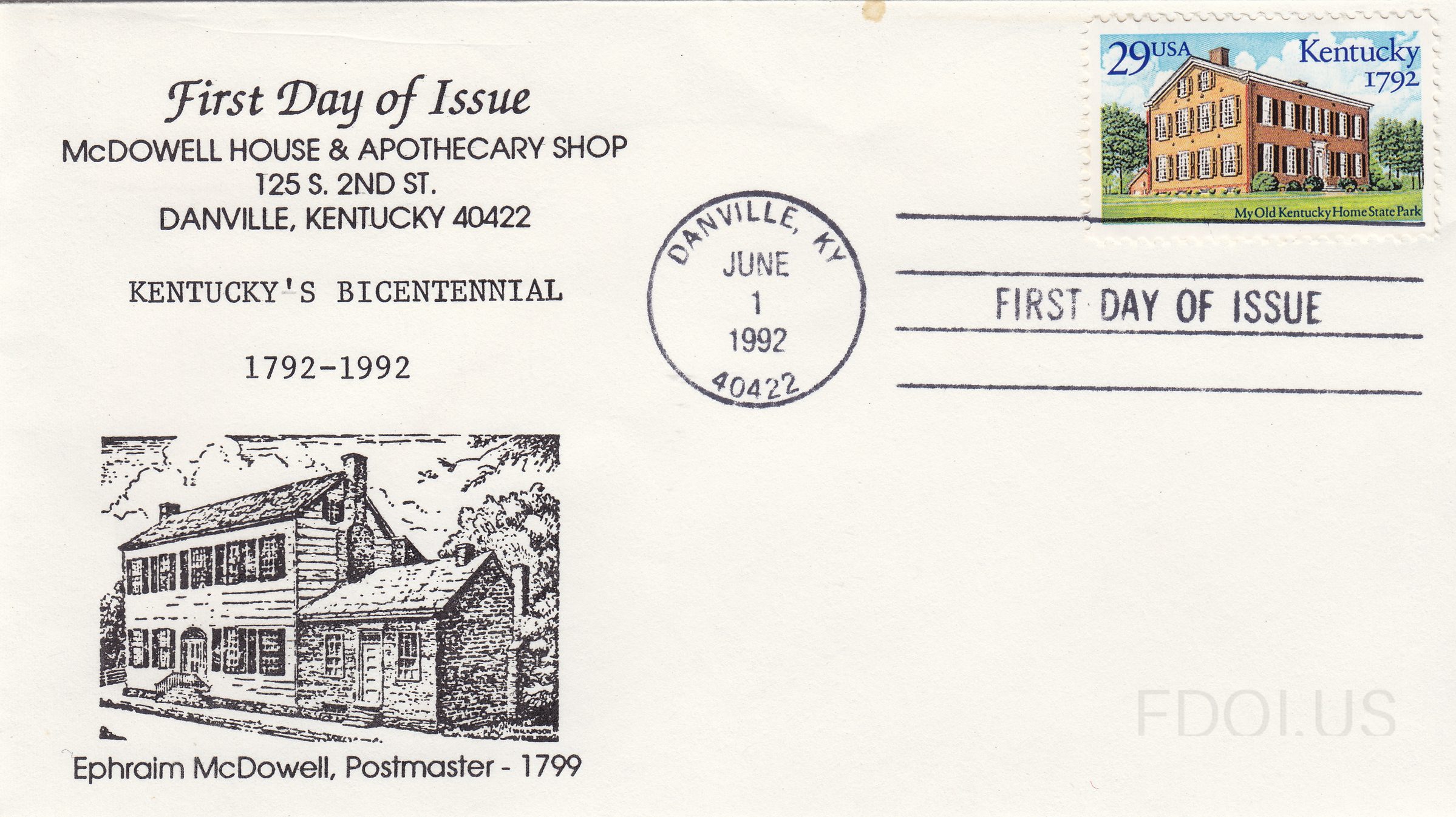 « Previous McDowell House and Apothecary Shop View Full Size All Images Hand-cancelled official FDC for Kentucky Statehood with cachet that has illustration of the McDowell House and notes Ephraim McDowell was postmaster in 1799. Format Other Tags EphraimMcdowell Kentucky OfficialFirstDay Dates & Locations June 1, 1992 Danville, KY, US Related Covers 1792 Kentucky Statehood Kentucky Statehood Bicentennial Kentucky Statehood Bicentennial Kentucky Statehood Bicentennial Kentucky 1792 Kentucky Statehood