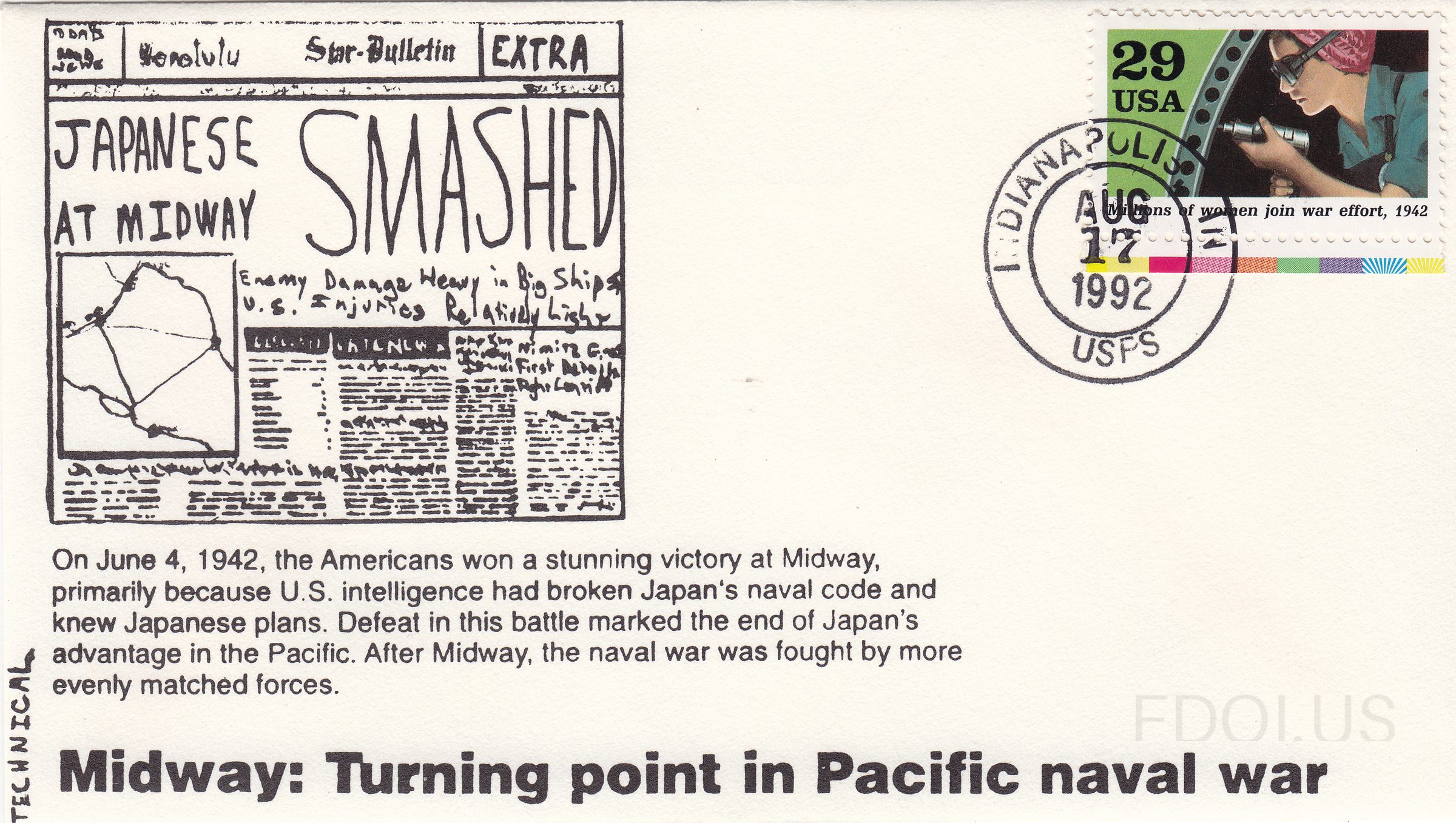 This cover celebrates two pivotal aspects of American World War II history: the decisive naval victory at Midway on June 4, 1942, depicted in the hand-drawn cachet showing a Honolulu Star-Bulletin newspaper headline, and the 29-cent stamp featuring a woman factory worker representing the millions of women who joined the war effort. Created by Technical Cachets and postmarked from Indianapolis, Indiana on August 17, 1992, the cover links a major military turning point with the vital home front contribution of American women.