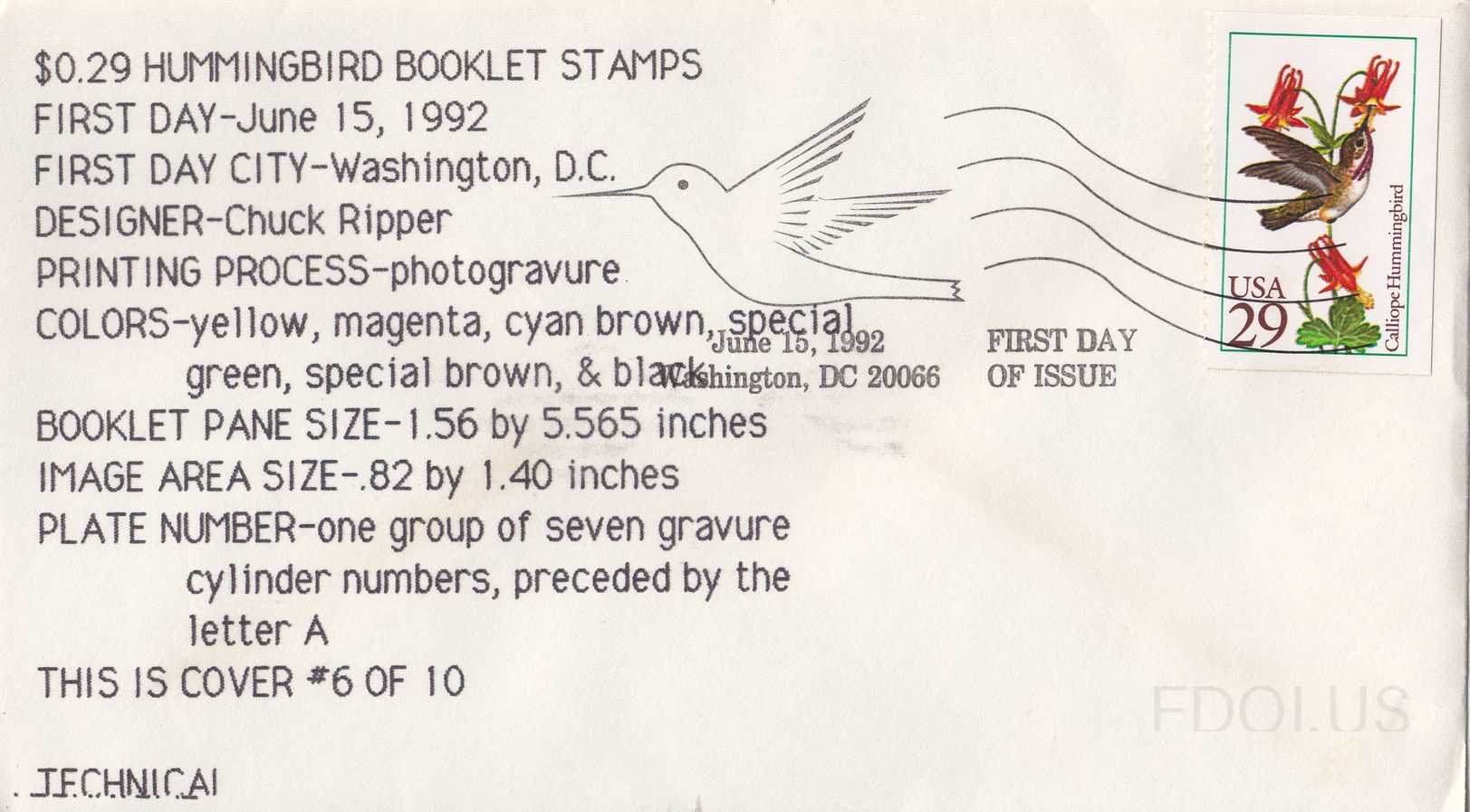 Images: Calliope Hummingbird 29¢ First Day Cover, June 15, 1992