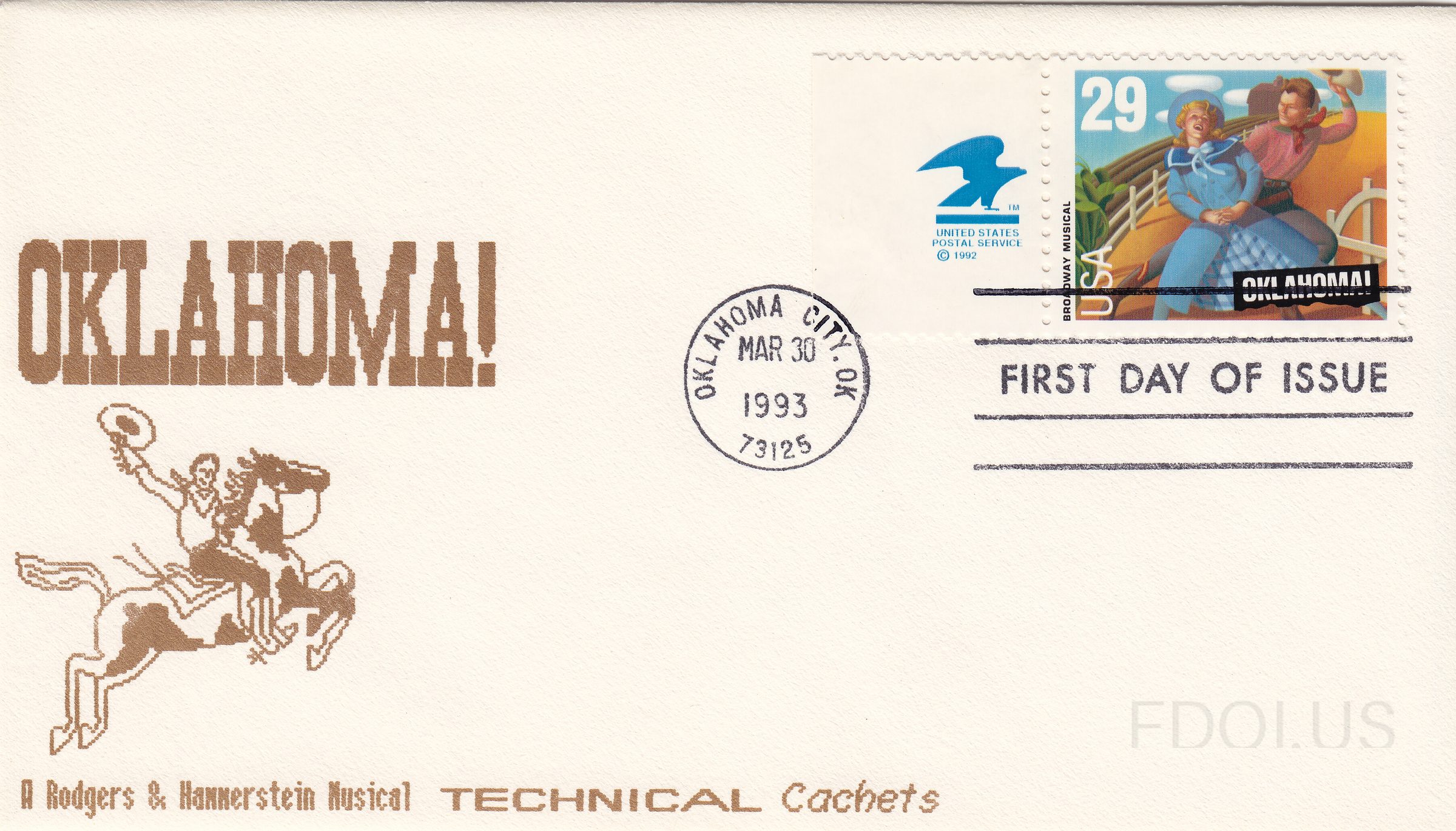 This Technical Cachets cover celebrates the 1993 Broadway Musicals stamp series honoring Rodgers & Hammerstein's iconic musical "Oklahoma!" The cachet features a spirited brown ink illustration of a cowboy on a galloping horse, while the 29-cent stamp depicts two dancing figures in period costume against a rural Oklahoma backdrop. Postmarked from Oklahoma City on March 30, 1993, this cover captures the spirit of the beloved theatrical classic.