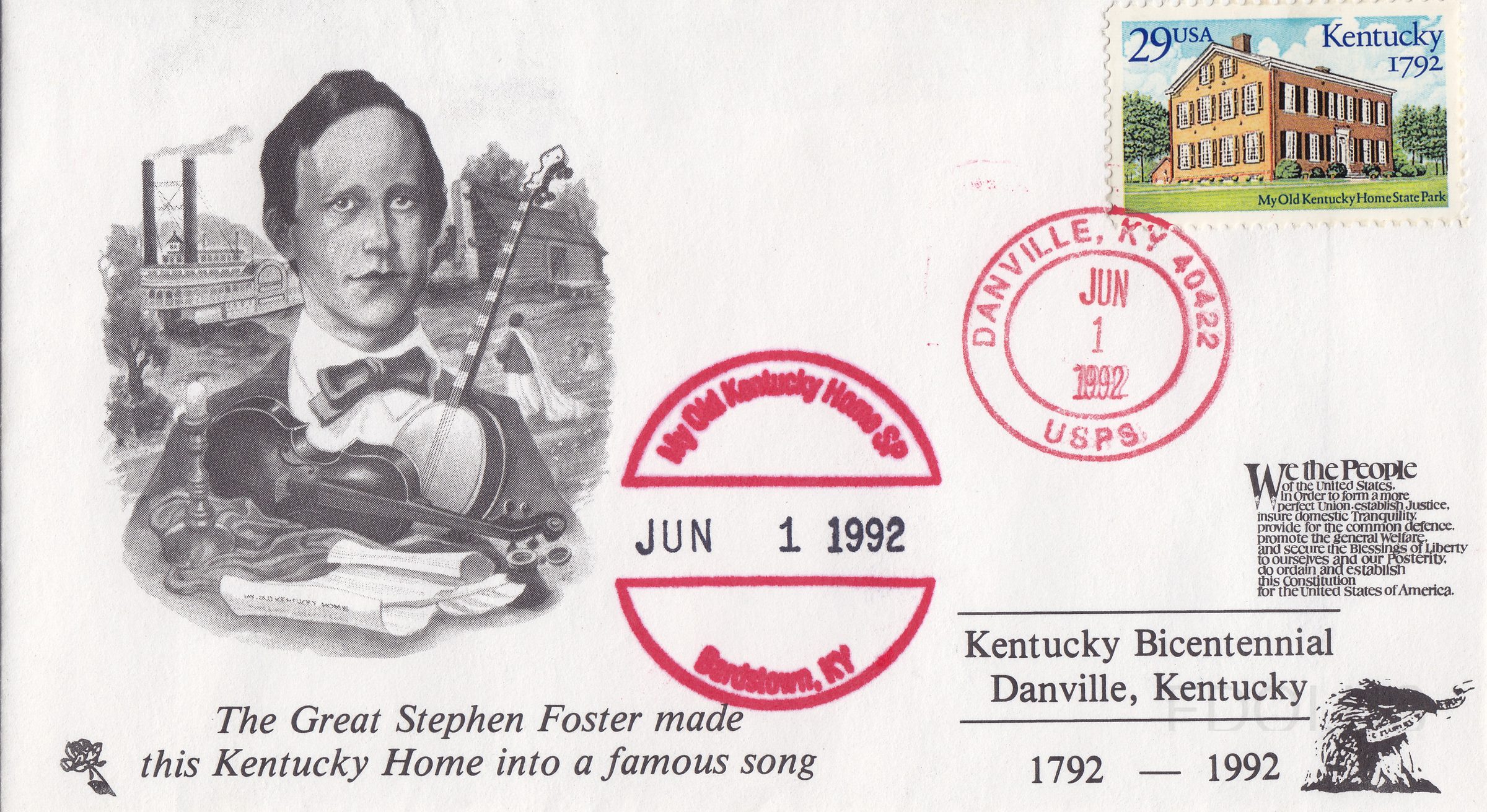 « Previous My Old Kentucky Home State Park View Full Size All Images Unofficial cancel from Danville alongside marking from My Old Kentucky Home State Park on cachet that reads The Great Stephen Foster made this Kentucky Home into a famous song. Tags AlternateCancel Kentucky Unaddressed UnofficialFirstDay Dates & Locations June 1, 1992 Danville, KY, US Related Covers McDowell House Unofficial FDC 1792 Kentucky Statehood Kentucky Statehood Bicentennial Winnipeg Centennial Stamp Exhibition My Old Kentucky Home in Bardstown Elvis Presley