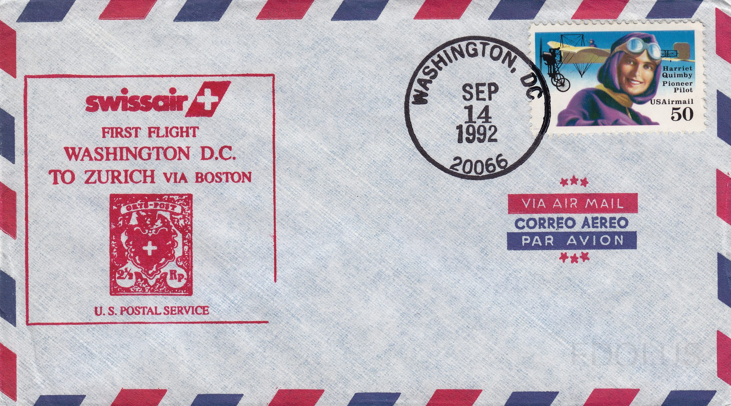 « Previous Swissair Washington DC to Zurich View Full Size All Images Additional Images First flight of Swissair from Washington DC to Zurich via Boston. Stamp is Harriet Quimby, Pioneer Pilot. Tags 1990s BackStamp FirstFlight MoreThanOneImage Switzerland Unaddressed UnitedStates ViaAirmail Dates & Locations Sept. 14, 1992 Washington, DC, US Related Covers Los Angeles to Frankfurt Ohio First Flight 1931 First Flight Savannah to Raleigh Remembering World's First Air Mail Flig… Cooperation in Space Translating War Into Peace