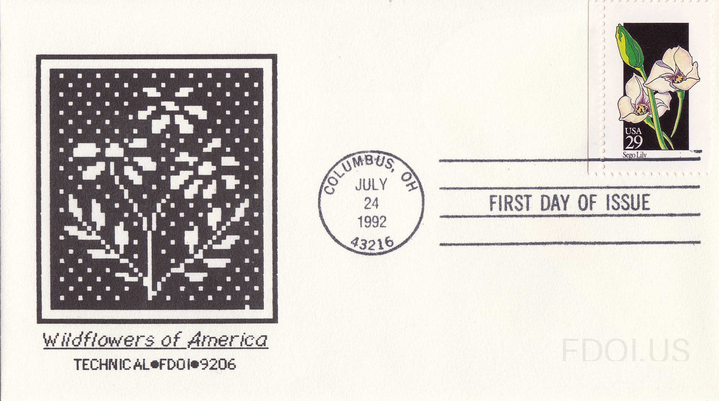 This First Day Cover features a striking pixelated needlepoint-style cachet of a wildflower rendered in black and white, commemorating the 1992 Wildflowers of America stamp series. The 29-cent Sego Lily stamp depicts delicate white lily blooms against a dark background and was canceled on July 24, 1992, in Columbus, Ohio. The cover was prepared by Technical FDOI, a respected cachet maker specializing in digital and artistic interpretations of stamp subjects.