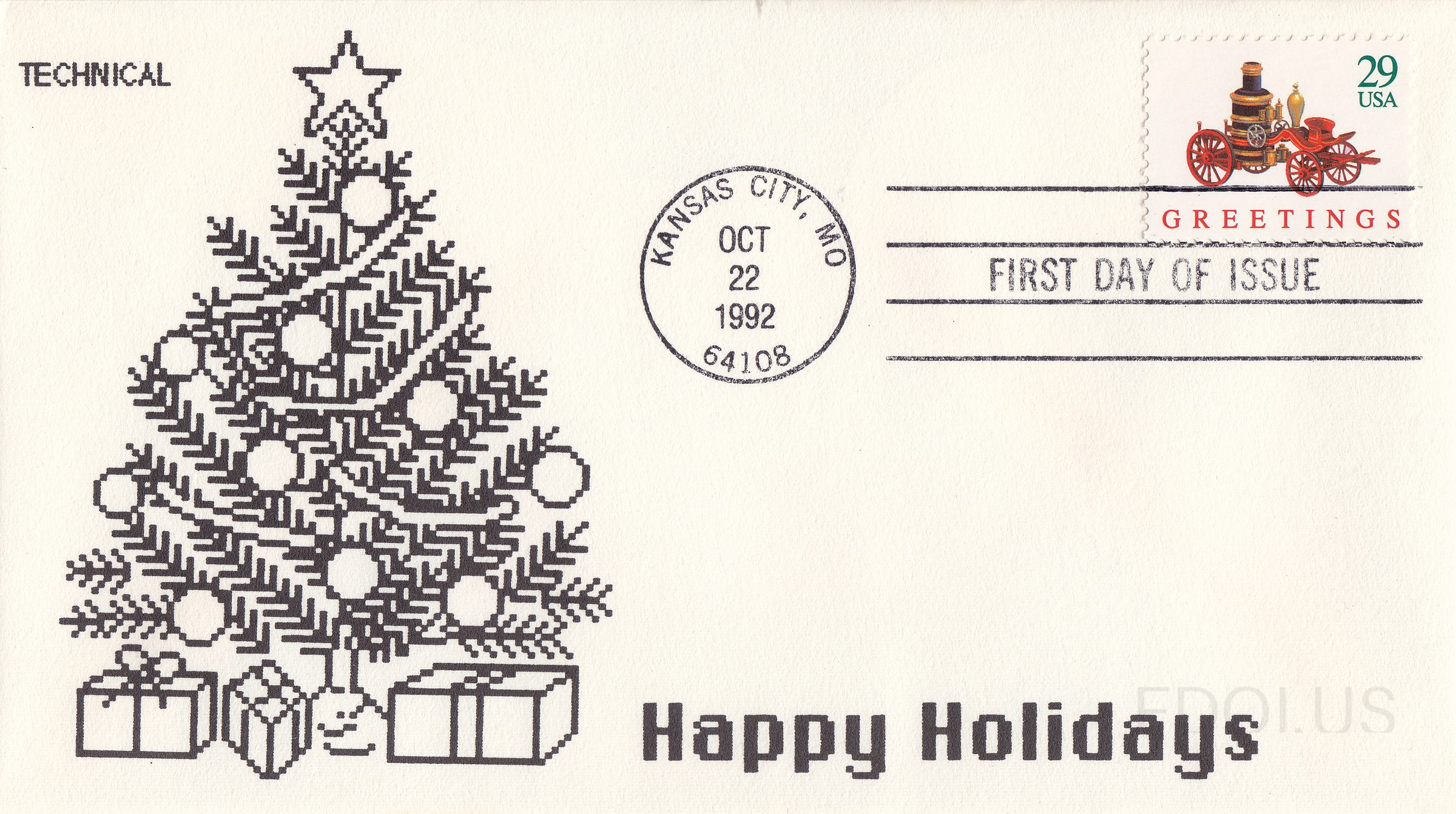 The cachet features a pixelated/computer-generated style Christmas tree rendered in black ink, decorated with ornaments, a star topper, and surrounded by wrapped gift boxes at the base. The text 'Happy Holidays' appears in bold dark lettering at the bottom right of the cachet, with 'TECHNICAL' printed in the upper left corner. The stamp is a 29-cent USA 'Greetings' issue depicting a red antique fire engine/pumper wagon in red and gold. The postmark is a standard machine cancellation from Kansas City, MO dated October 22, 1992.