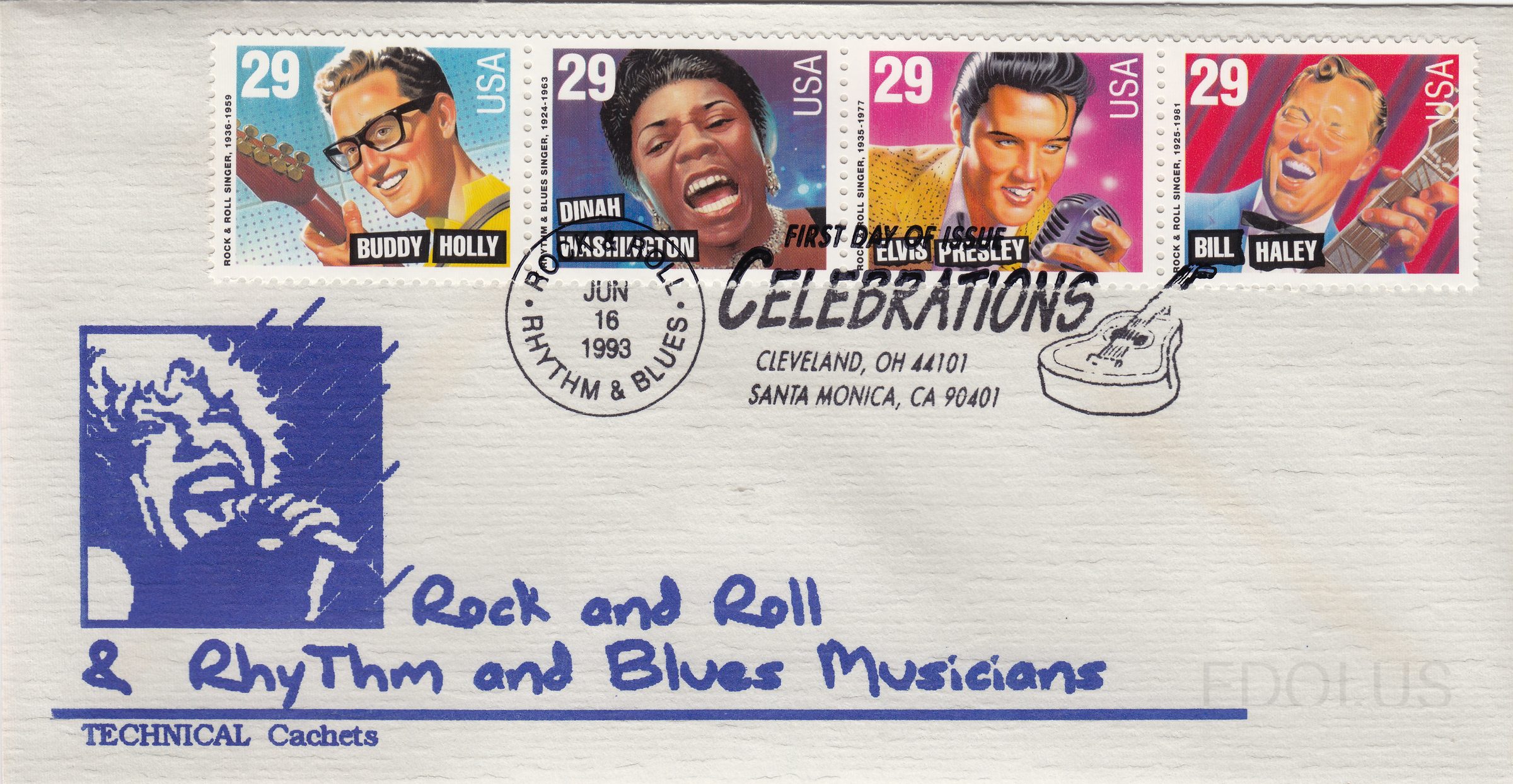 « Previous Next » Musicians strip of four View Full Size All Images Rock and Roll and Rhythm and Blues Musicians with Buddy Holly, Dinah Washington, Elvis Presley, and Bill Haley Cachet Technical Cachets Format Other Tags ElvisPresley Music OfficialFirstDay TechnicalCachets Related Covers Elvis Presley second release Elvis Presley, plate corner Otis Redding Bill Haley Musicians plate number strip of three. Clyde McPhatter