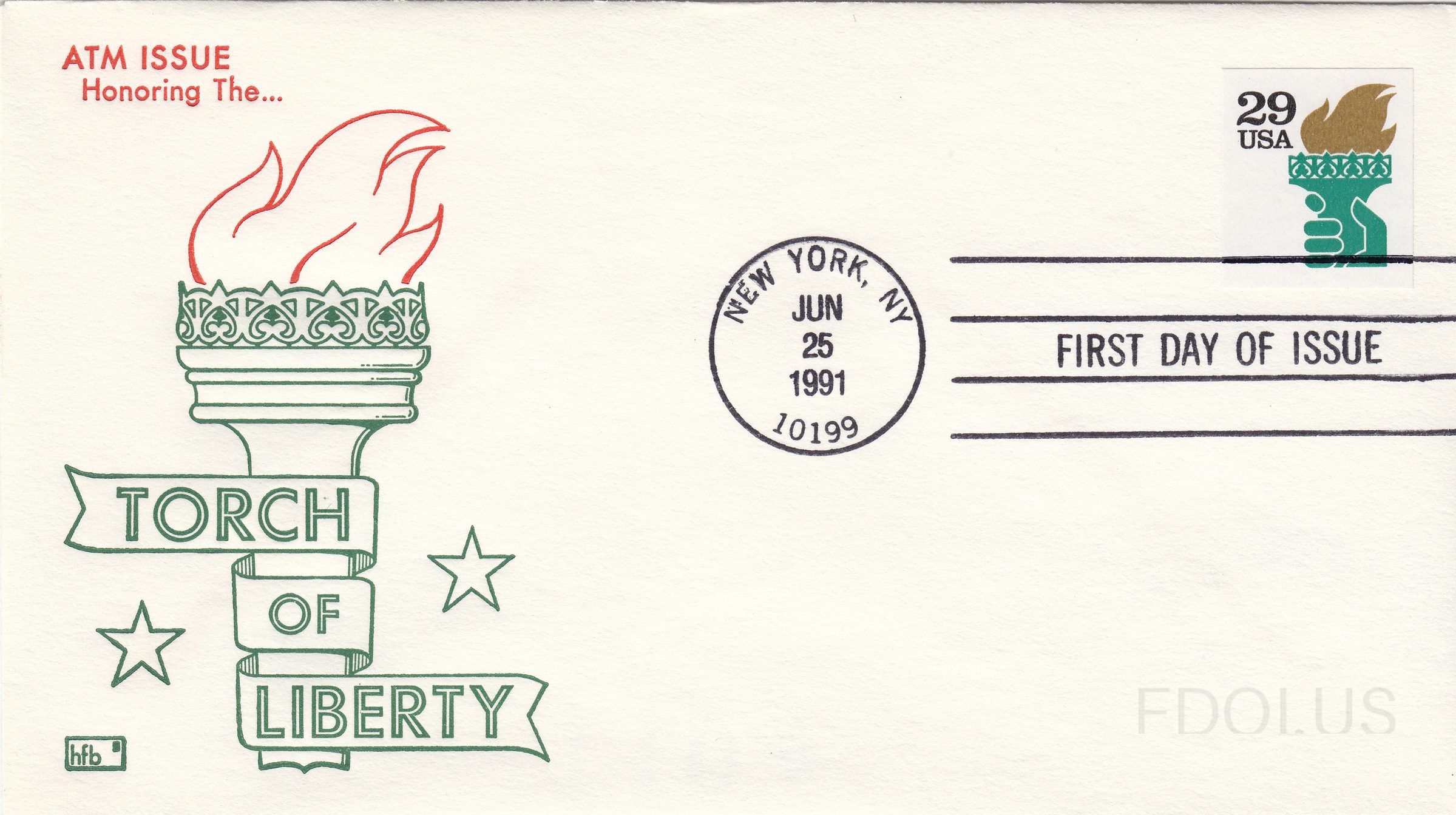 « Previous ATM Issue Honoring the Torch of Liberty View Full Size All Images ATM Issue Honoring the Torch of Liberty Tags OfficialFirstDay SelfAdhesive StatueOfLiberty TwoColors Dates & Locations June 25, 1991 New York, NY, US Related Covers Statue of Liberty at Americover 1994 Bartholdi\'s Vision USPS Statue of Liberty plate number Statue of Liberty at Americover 1994 Haines City Liberty Pugh Cachets Statue of Liberty for Amer…