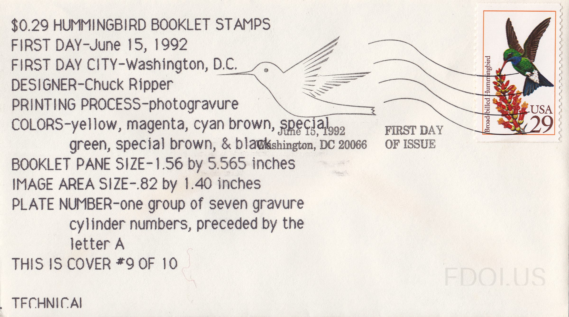 Broad-billed Hummingbird 29¢ Stamp, Technical Cachets #9, June 15, 1992