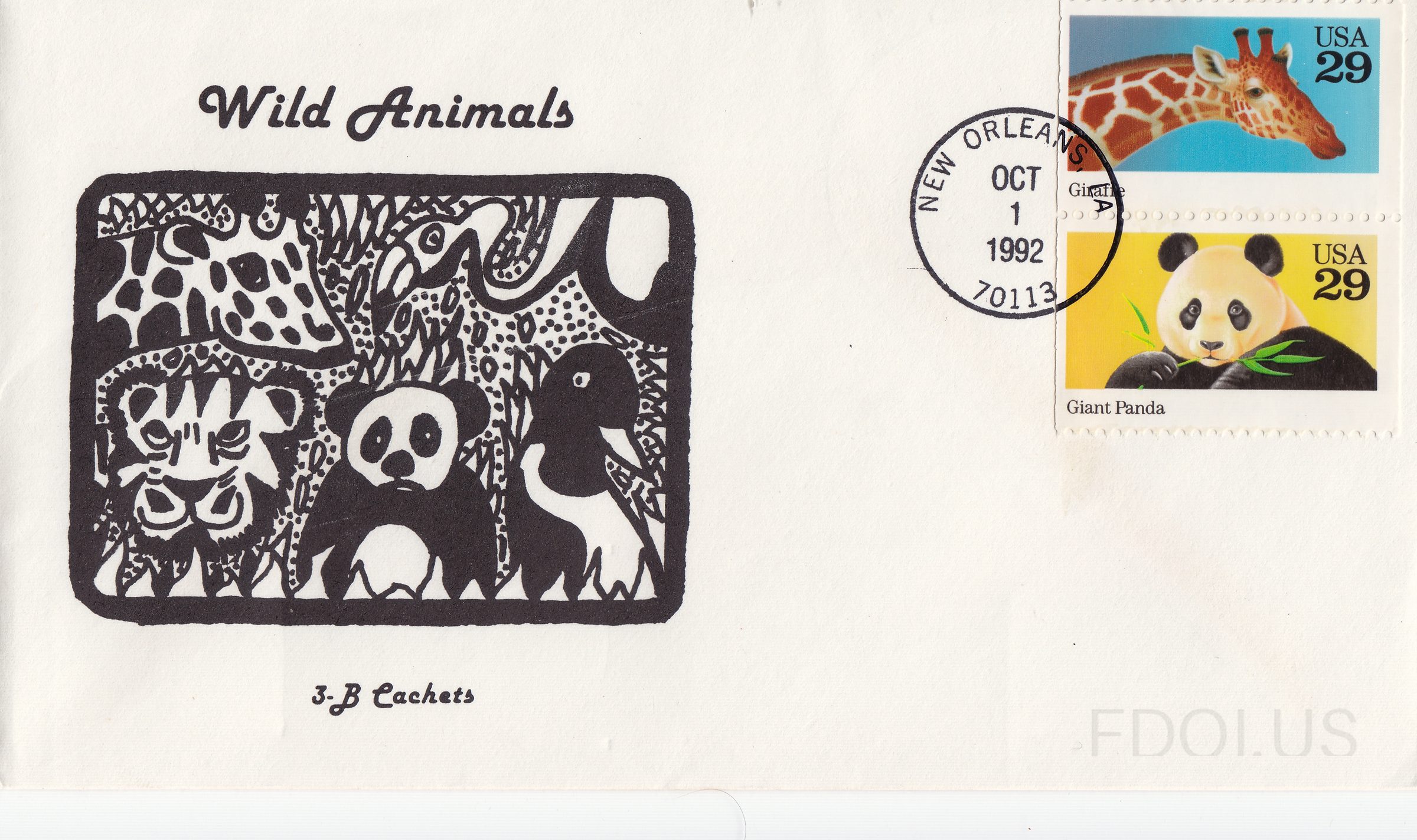 « Previous Next » Wild Animals Giraffe and Giant Panda View Full Size All Images 3-B Cachet for Wild Animals Giraffe and Giant Panda Format Other Tags Animals CropImage OfficialFirstDay PairOfStamps Series Dates & Locations Oct. 1, 1992 New Orleans, LA, US Related Covers Wild Animals Flamingo and King Penguins Giant Panda Wild Animals, New Orleans Wild Animals, booklet Minerals 1992 Variscite Cooperation in Space