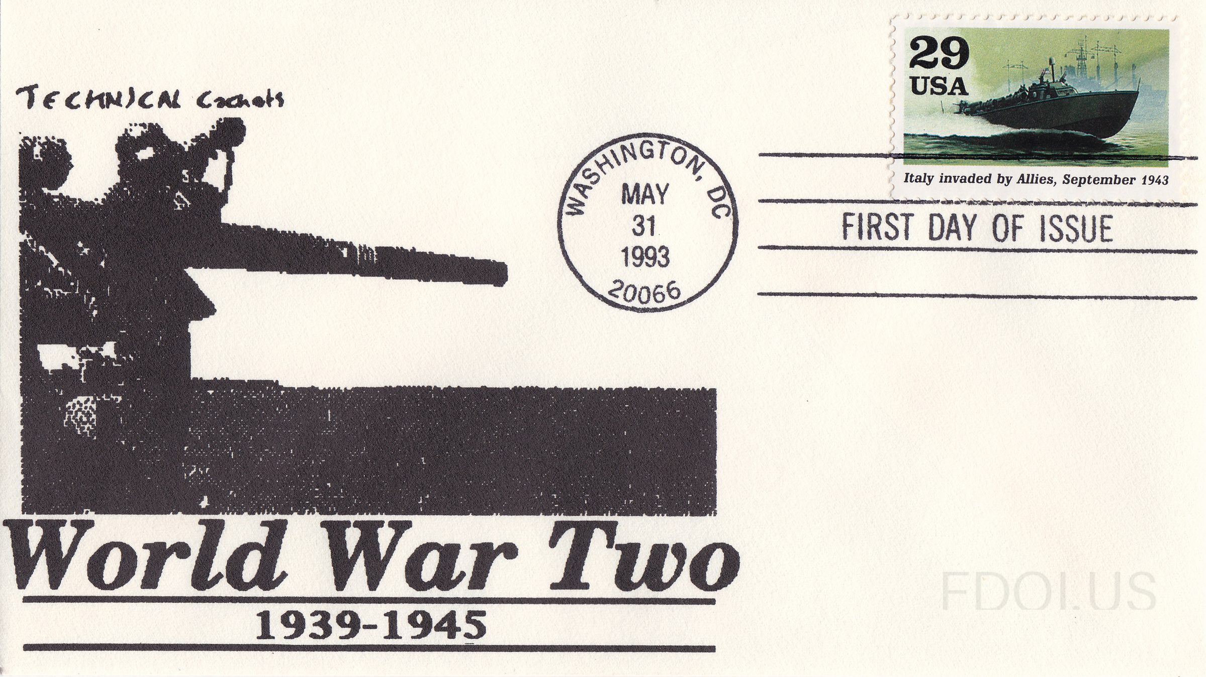 This cover honors the Allied invasion of Italy in September 1943, featuring a 29-cent stamp depicting a swift PT boat in action. The dramatic black-and-white cachet by Technical Cachets showcases naval gunners operating a large artillery piece, reinforcing the military theme of the World War II series. Postmarked from Washington, DC on May 31, 1993, this cover combines historical significance with a clean presentation befitting a significant wartime milestone.
